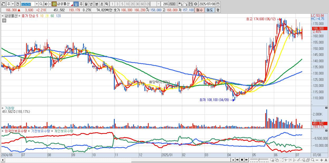 - 삼성물산 (166,600원 ▲ 2.4% , 시총: 283,181억, 외국인 순매수 거래금:138억)