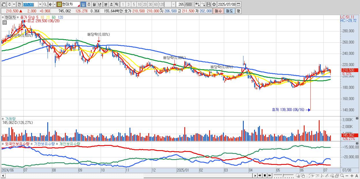 - 현대차 (211,000원 ▲ 1.2% , 시총: 432,039억, 외국인 순매수 거래금:206억)