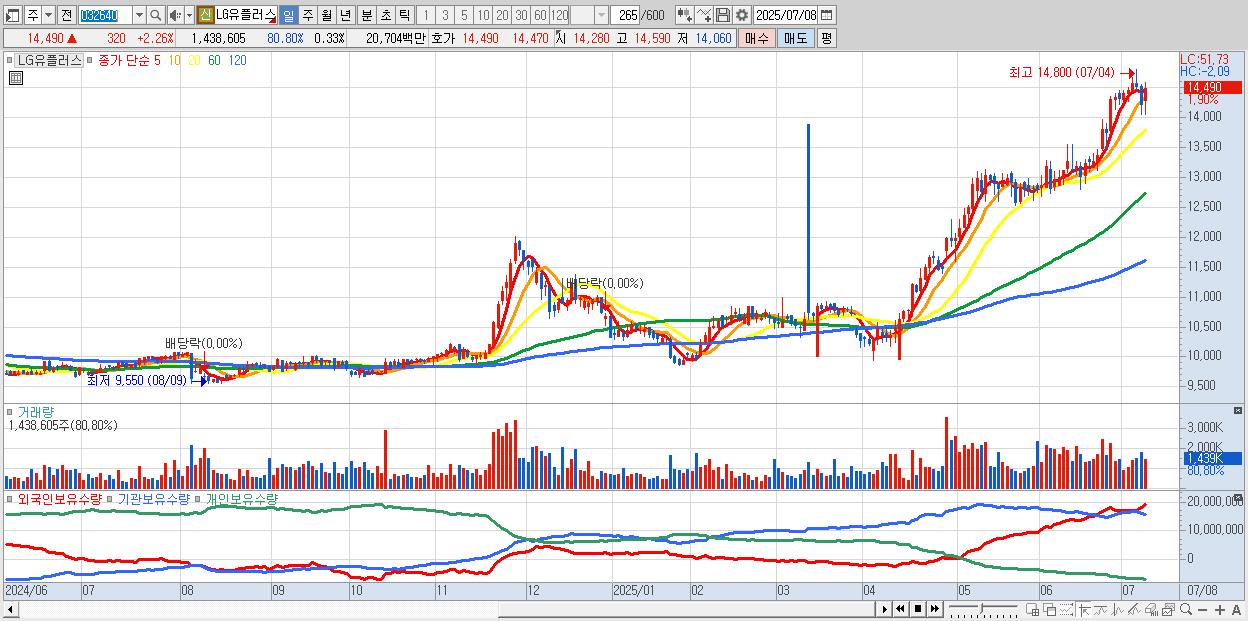 - LG유플러스 (14,590원 ▲ 2.96% , 시총: 63,702억, 외국인 순매수 거래금:72억)