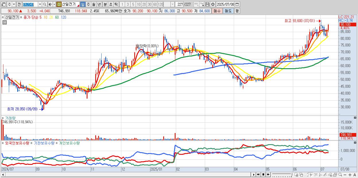- 산일전기 (90,200원 ▲ 4.16% , 시총: 27,462억, 외국인 순매수 거래금:67억)