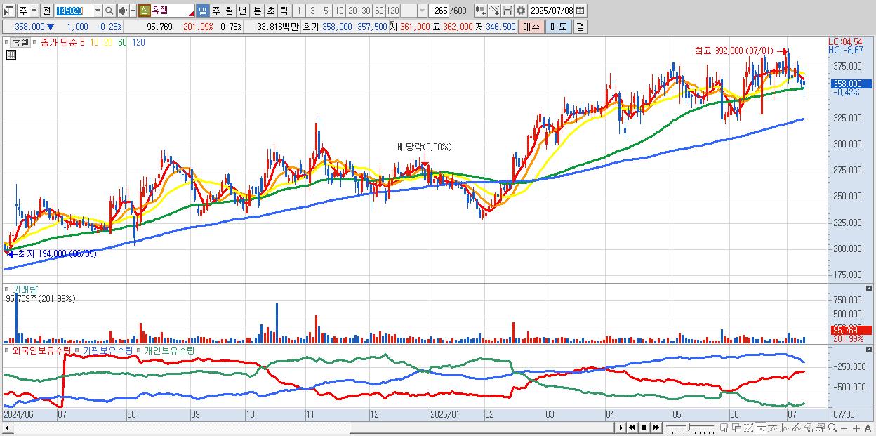 - 휴젤 (358,000원 ▼ -0.28% , 시총: 44,048억, 외국인 순매수 거래금:77억)