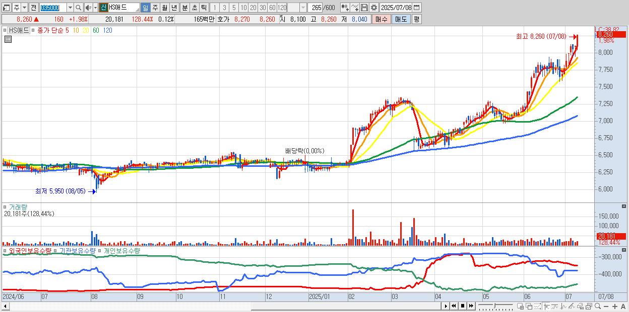 - HS애드 (8,260원 ▲ 1.98% , 시총: 1,368억, 거래량: 20,181, 거래대금:2억, KOSPI)