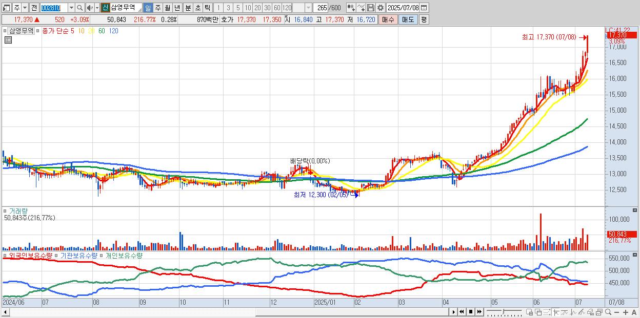 - 삼영무역 (17,370원 ▲ 3.09% , 시총: 3,208억, 거래량: 50,843, 거래대금:9억, KOSPI)