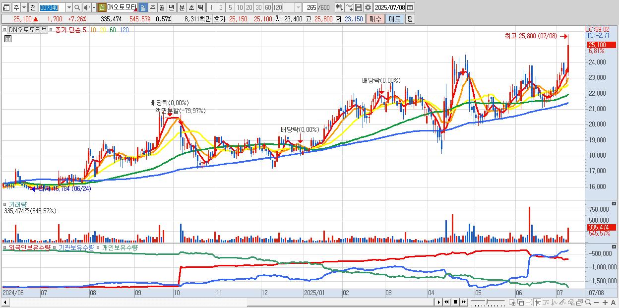 - DN오토모티브 (25,100원 ▲ 7.26% , 시총: 14,686억, 거래량: 253,377, 거래대금:63억, KOSPI)