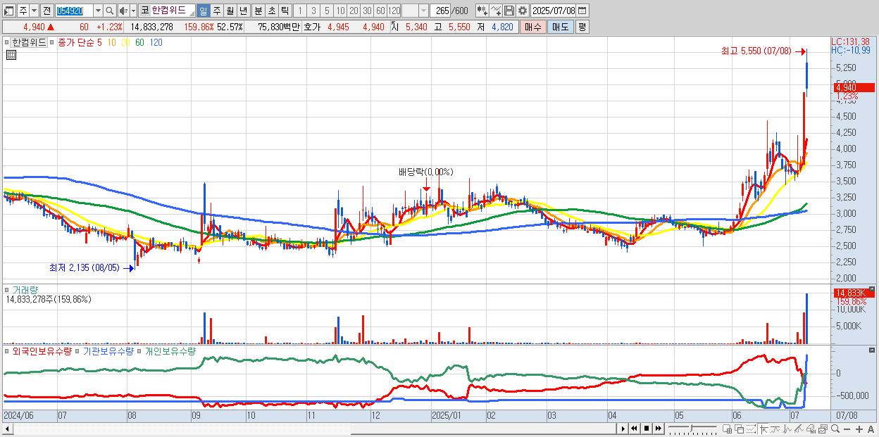 - 한컴위드 (4,940원 ▲ 1.23% , 시총: 1,394억, 거래량: 14,833,278, 거래대금:758억, KOSDAQ)