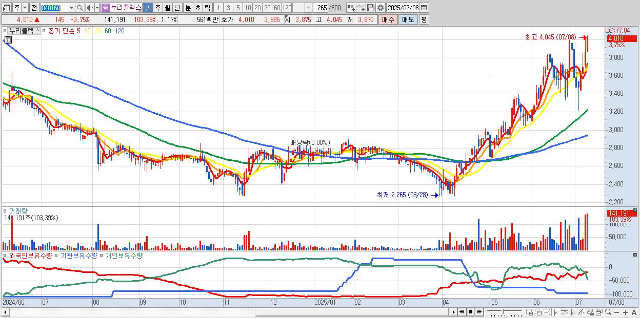 - 누리플렉스 (4,010원 ▲ 3.75% , 시총: 483억, 거래량: 141,191, 거래대금:6억, KOSDAQ)