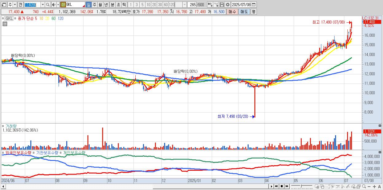 - GKL (17,400원 ▲ 4.44% , 시총: 10,763억, 거래량: 720,735, 거래대금:122억, KOSPI)