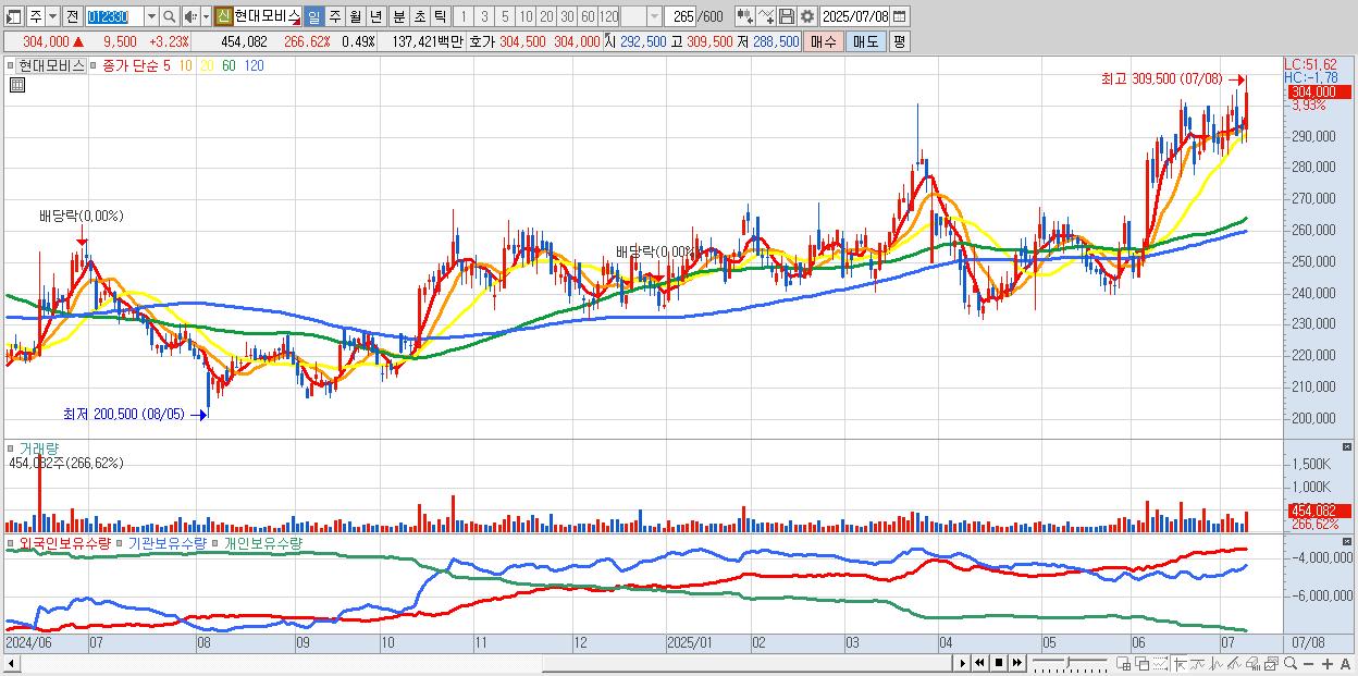 - 현대모비스 (305,000원 ▲ 3.57% , 시총: 279,975억, 거래량: 357,902, 거래대금:1,084억, KOSPI)