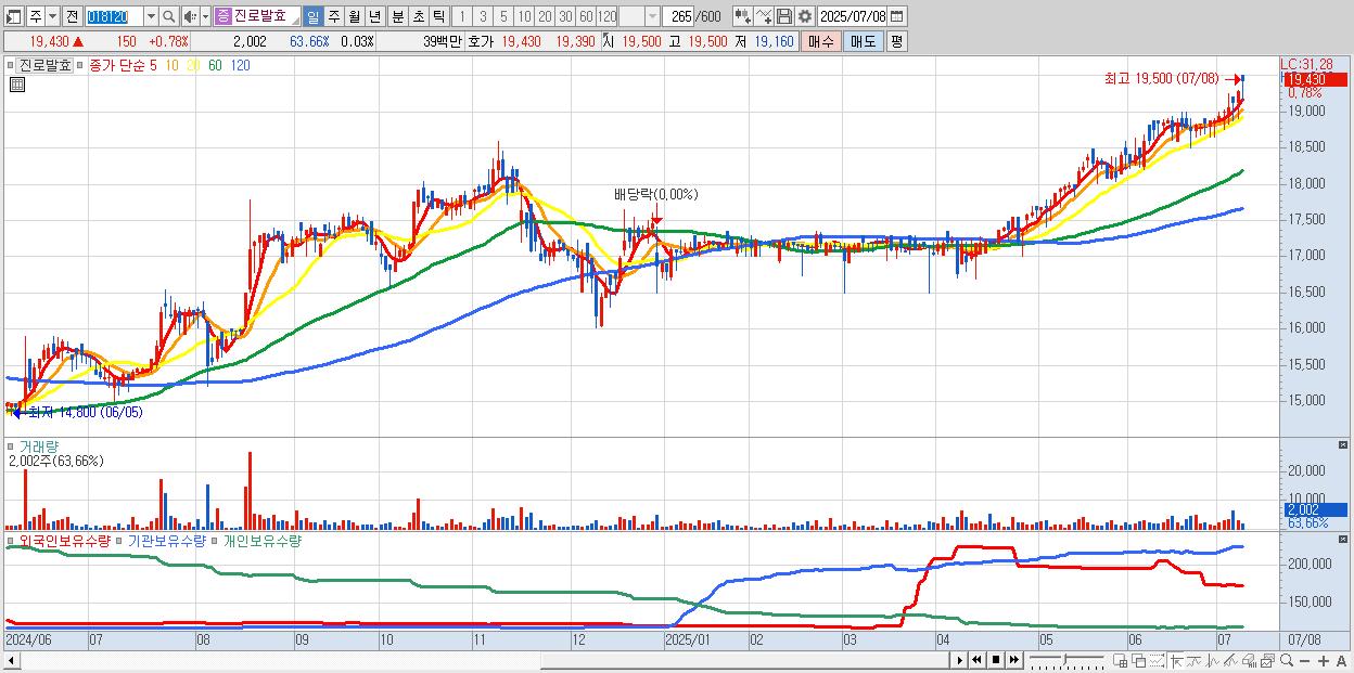진로발효 19,430원 ▲ 0.78% (KOSDAQ, 018120)