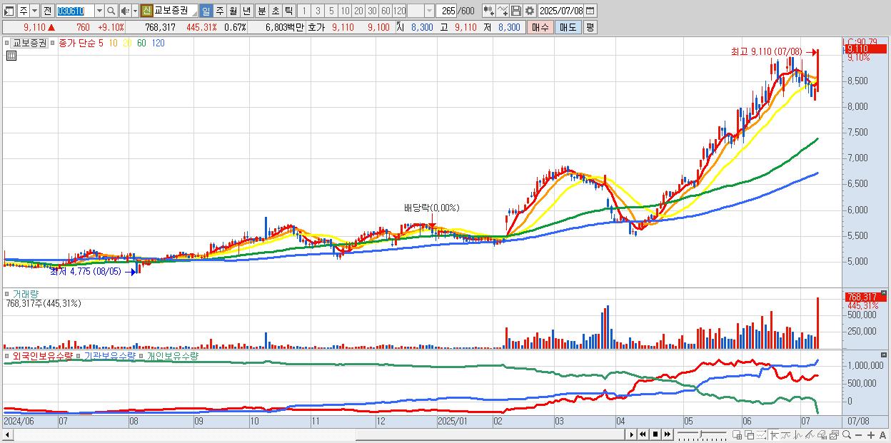 - 교보증권 (9,110원 ▲ 9.1% , 시총: 10,382억, 거래량: 768,317, 거래대금:68억, KOSPI)