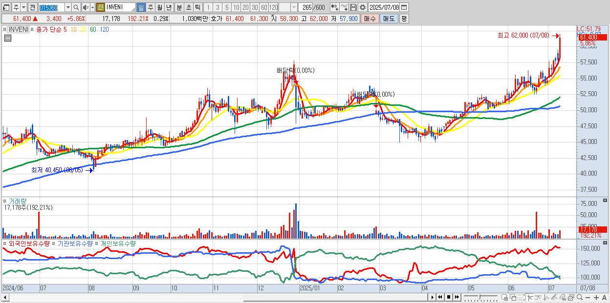 - INVENI (61,400원 ▲ 5.86% , 시총: 3,684억, 거래량: 17,178, 거래대금:10억, KOSPI)