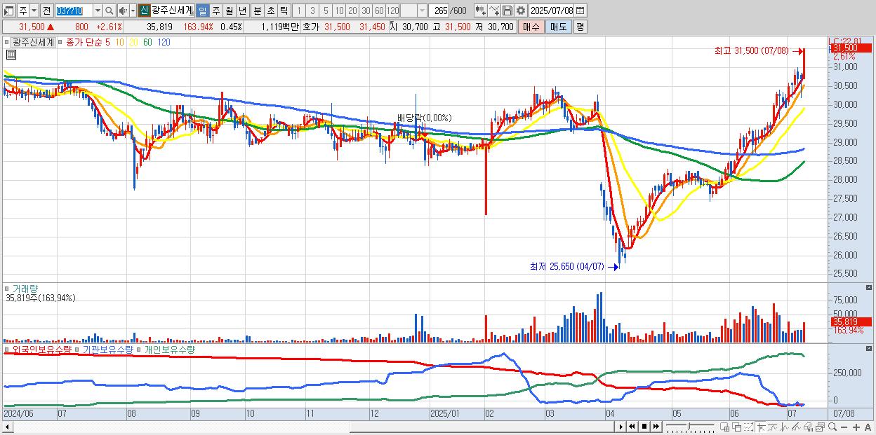- 광주신세계 (31,500원 ▲ 2.61% , 시총: 2,507억, 거래량: 35,819, 거래대금:11억, KOSPI)