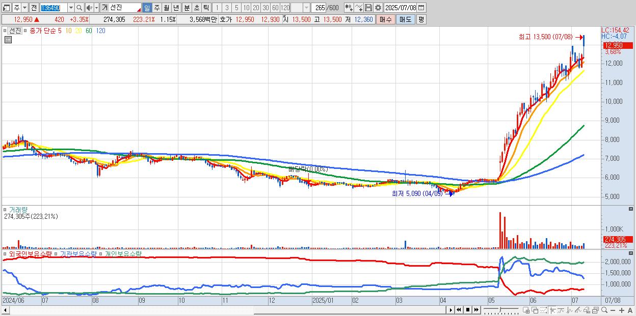 - 선진 (12,950원 ▲ 3.35% , 시총: 3,079억, 거래량: 170,809, 거래대금:22억, KOSPI)