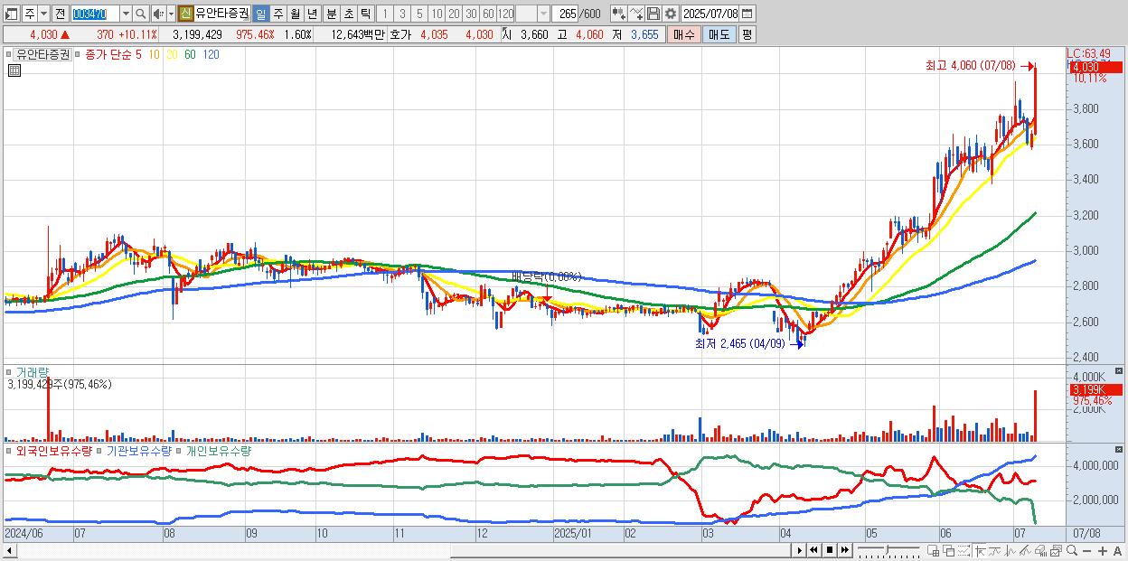 - 유안타증권 (4,030원 ▲ 10.11% , 시총: 8,044억, 거래량: 3,199,429, 거래대금:126억, KOSPI)