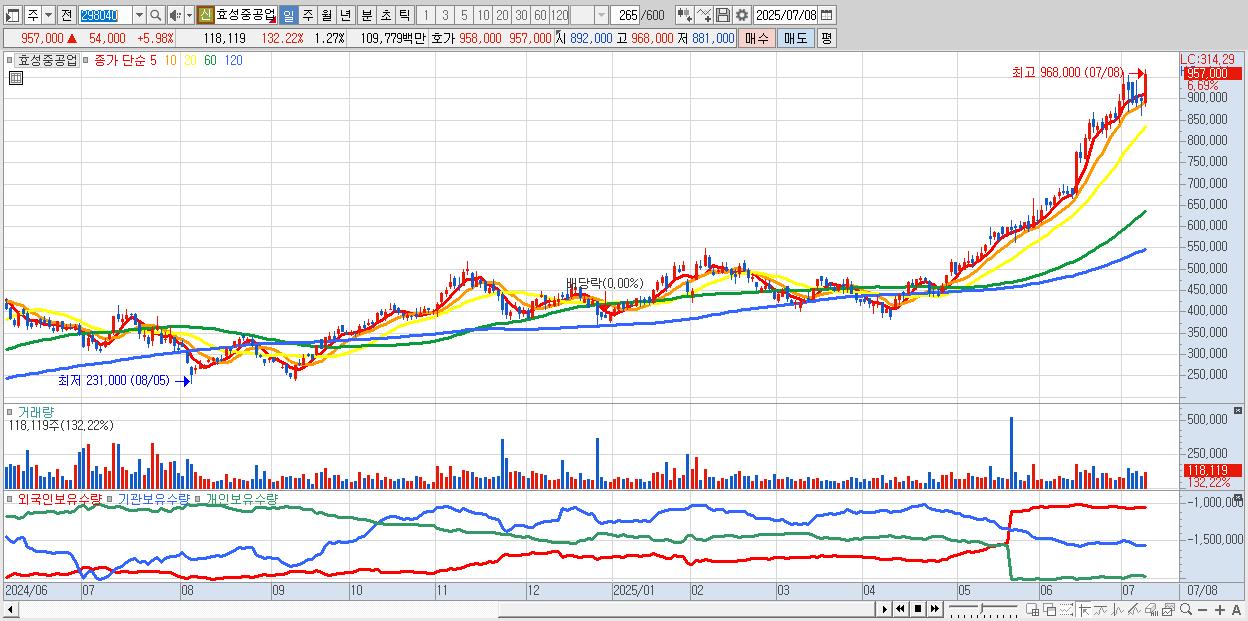 - 효성중공업 (960,000원 ▲ 6.31% , 시총: 89,516억, 거래량: 88,836, 거래대금:826억, KOSPI)