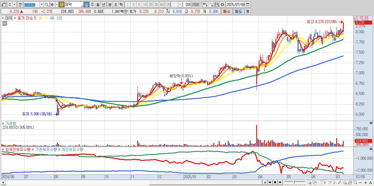 - 대덕 (8,220원 ▲ 2.37% , 시총: 2,786억, 거래량: 224,803, 거래대금:18억, KOSPI)