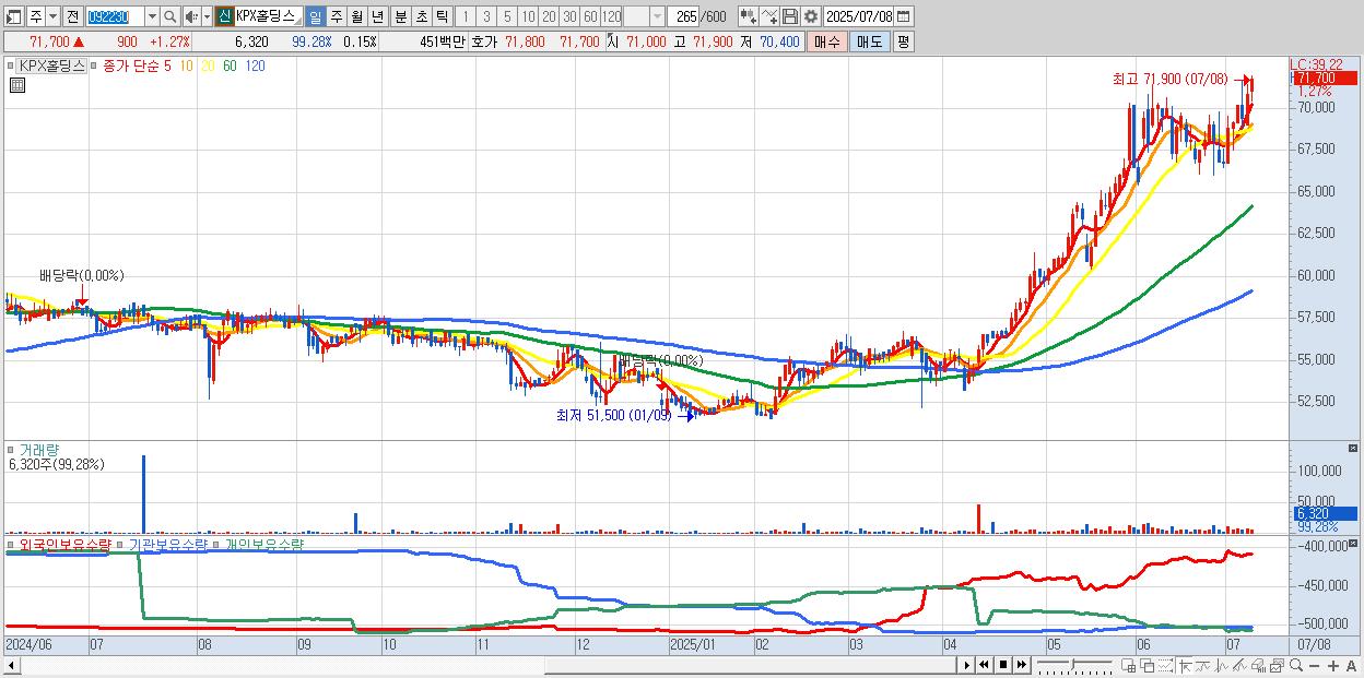 - KPX홀딩스 (71,700원 ▲ 1.27% , 시총: 3,029억, 거래량: 6,320, 거래대금:5억, KOSPI)