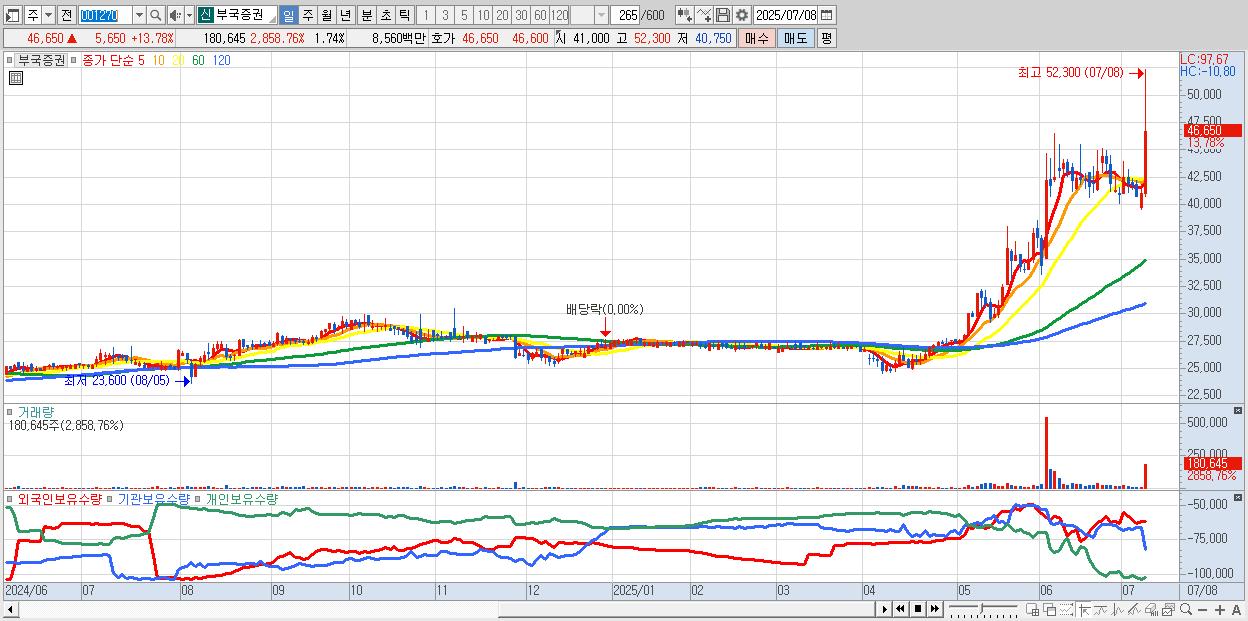 - 부국증권 (46,650원 ▲ 13.78% , 시총: 4,838억, 거래량: 180,645, 거래대금:86억, KOSPI)