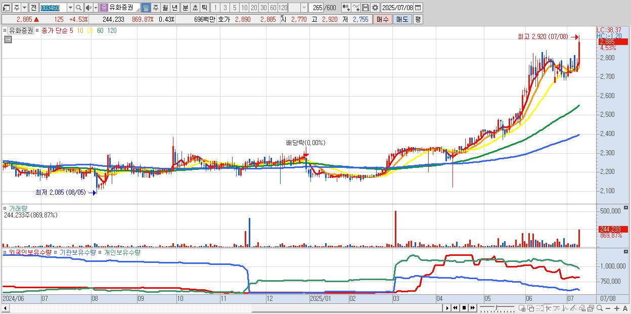 - 유화증권 (2,885원 ▲ 4.53% , 시총: 1,636억, 거래량: 244,233, 거래대금:7억, KOSPI)