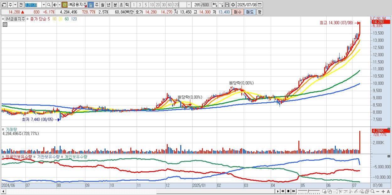 - iM금융지주 (14,240원 ▲ 5.87% , 시총: 23,694억, 거래량: 4,094,057, 거래대금:582억, KOSPI)