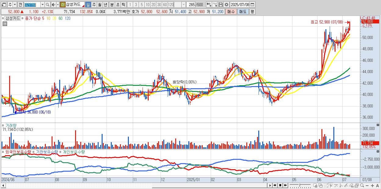 - 삼성카드 (52,600원 ▲ 1.74% , 시총: 60,942억, 거래량: 53,626, 거래대금:28억, KOSPI)
