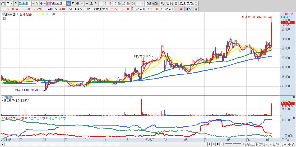 - 안트로젠 (27,500원 ▲ 22.77% , 시총: 2,752억, 거래량: 448,858, 거래대금:121억, KOSDAQ)