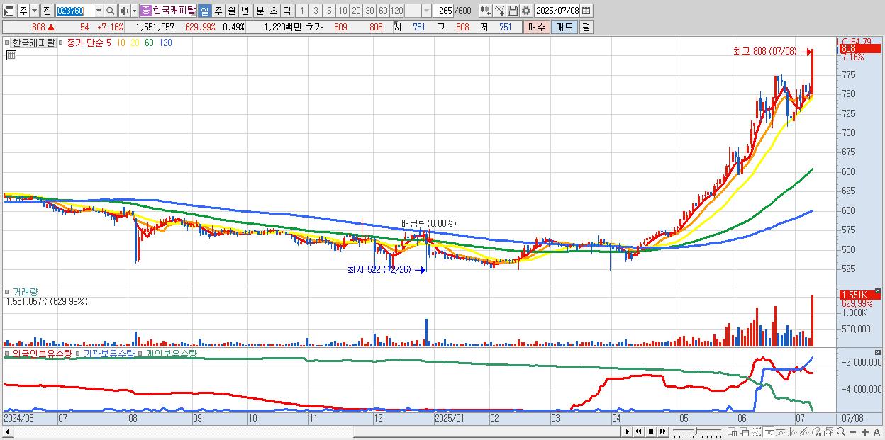 - 한국캐피탈 (808원 ▲ 7.16% , 시총: 2,550억, 거래량: 1,551,057, 거래대금:12억, KOSDAQ)