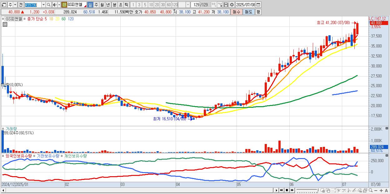 - GS피앤엘 (40,950원 ▲ 3.41% , 시총: 8,121억, 거래량: 244,002, 거래대금:98억, KOSPI)