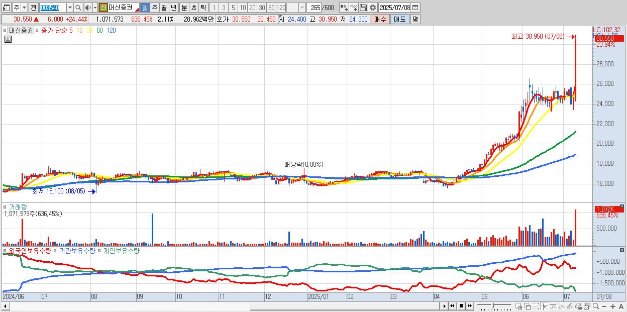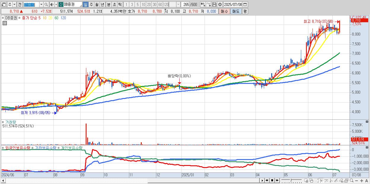- DB증권 (8,710원 ▲ 7.53% , 시총: 3,697억, 거래량: 511,574, 거래대금:44억, KOSPI)
