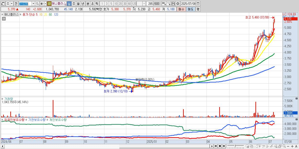 - 애니플러스 (5,370원 ▲ 2.68% , 시총: 2,631억, 거래량: 1,043,793, 거래대금:56억, KOSDAQ)
