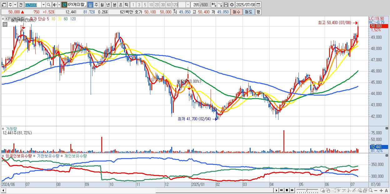 - KPX케미칼 (50,000원 ▲ 1.52% , 시총: 2,420억, 거래량: 12,441, 거래대금:6억, KOSPI)