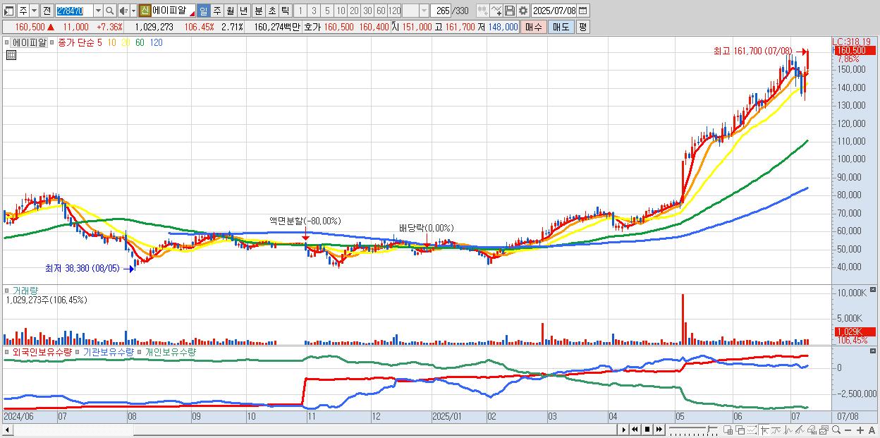 - 에이피알 (161,200원 ▲ 7.83% , 시총: 61,327억, 거래량: 648,875, 거래대금:1,012억, KOSPI)