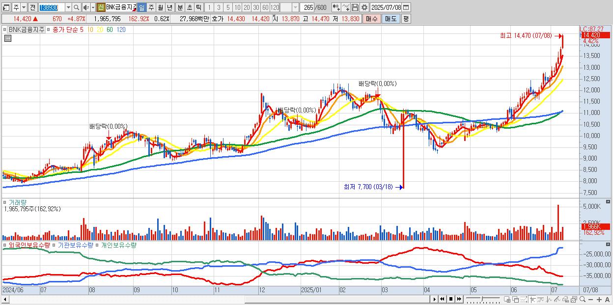 - BNK금융지주 (14,400원 ▲ 4.73% , 시총: 45,847억, 거래량: 1,539,800, 거래대금:219억, KOSPI)