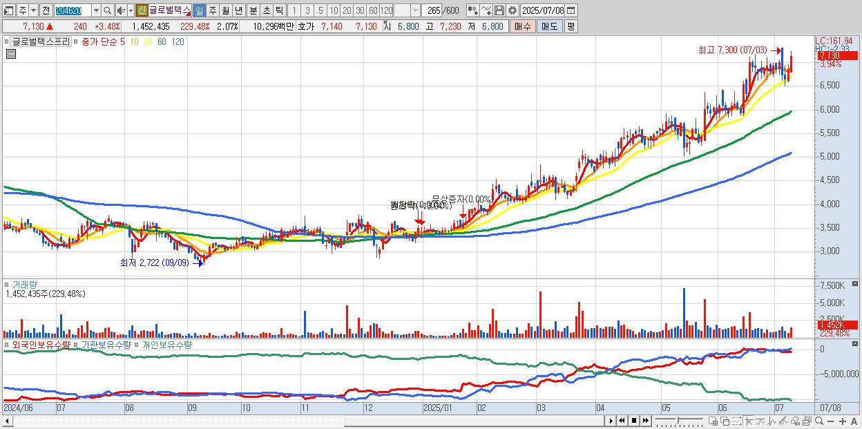 - 글로벌텍스프리 (7,140원 ▲ 3.63% , 시총: 5,018억, 거래량: 1,019,562, 거래대금:72억, KOSDAQ)