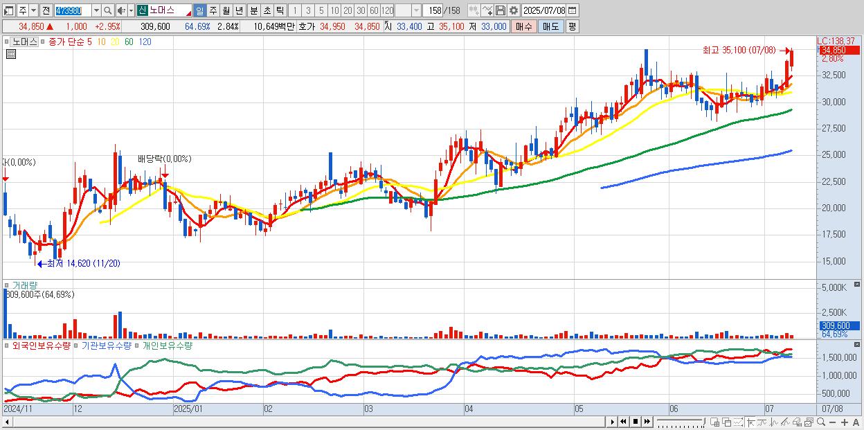 - 노머스 (34,800원 ▲ 2.81% , 시총: 3,789억, 거래량: 196,589, 거래대금:68억, KOSDAQ)