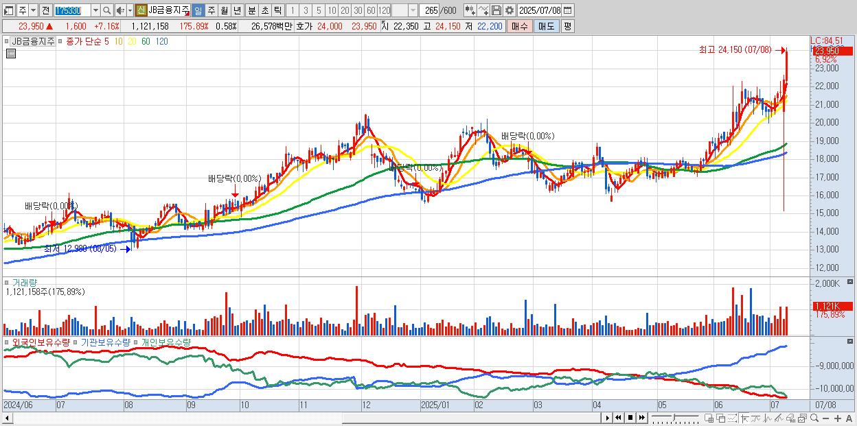 - JB금융지주 (23,850원 ▲ 6.71% , 시총: 46,247억, 거래량: 1,031,739, 거래대금:245억, KOSPI)