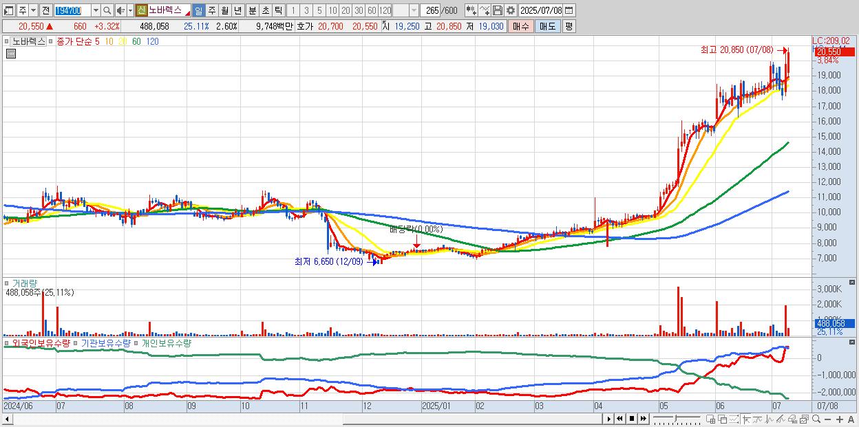 - 노바렉스 (20,650원 ▲ 3.82% , 시총: 3,873억, 거래량: 339,925, 거래대금:68억, KOSDAQ)
