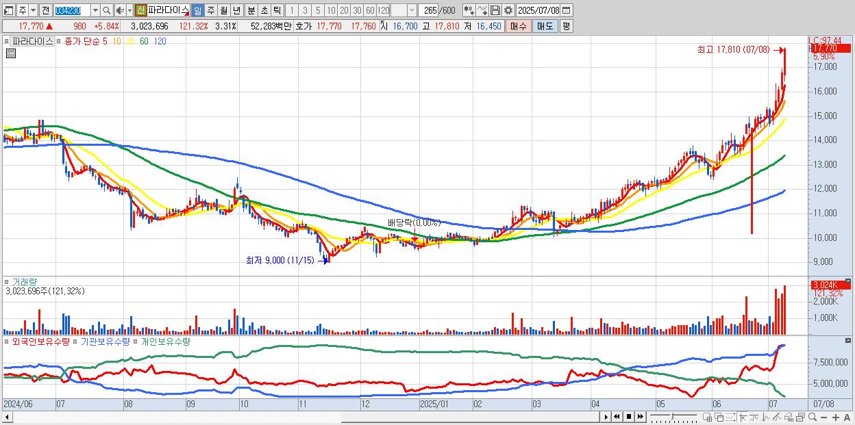 - 파라다이스 (17,780원 ▲ 5.9% , 시총: 16,221억, 거래량: 1,961,269, 거래대금:340억, KOSPI)