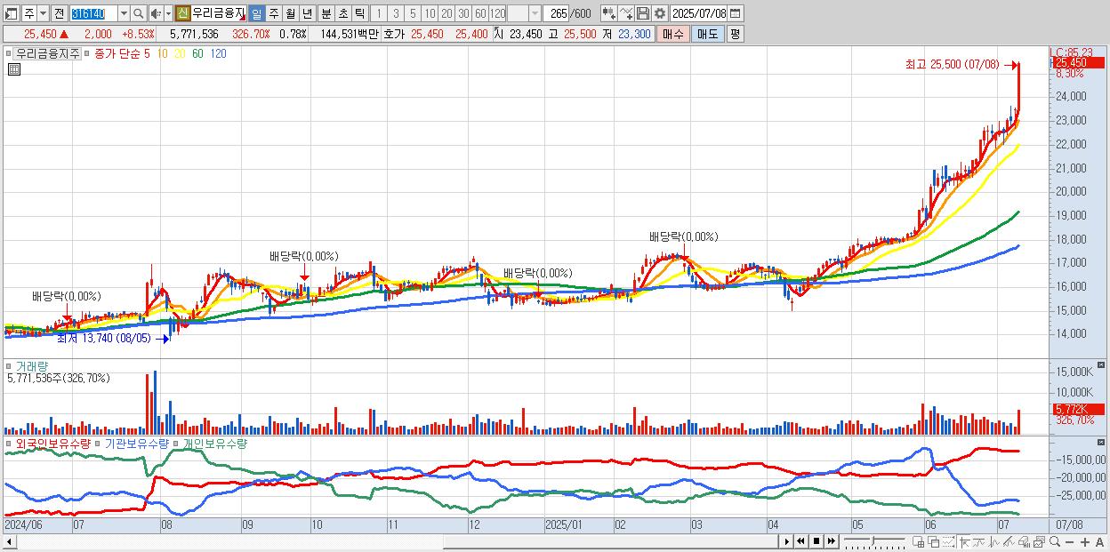 - 우리금융지주 (25,400원 ▲ 8.32% , 시총: 188,618억, 거래량: 4,141,325, 거래대금:1,038억, KOSPI)