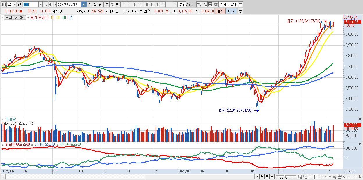 | 07/08 | 3,114.95 | ▲1.81% | -2,549억 | 2,461억 | -326억 | 414억 |