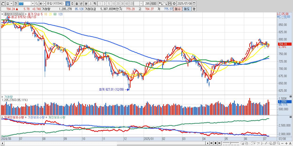 | 07/08 | 784.24 | ▲0.74% | 727억 | 360억 | -1,124억 | 36억 |