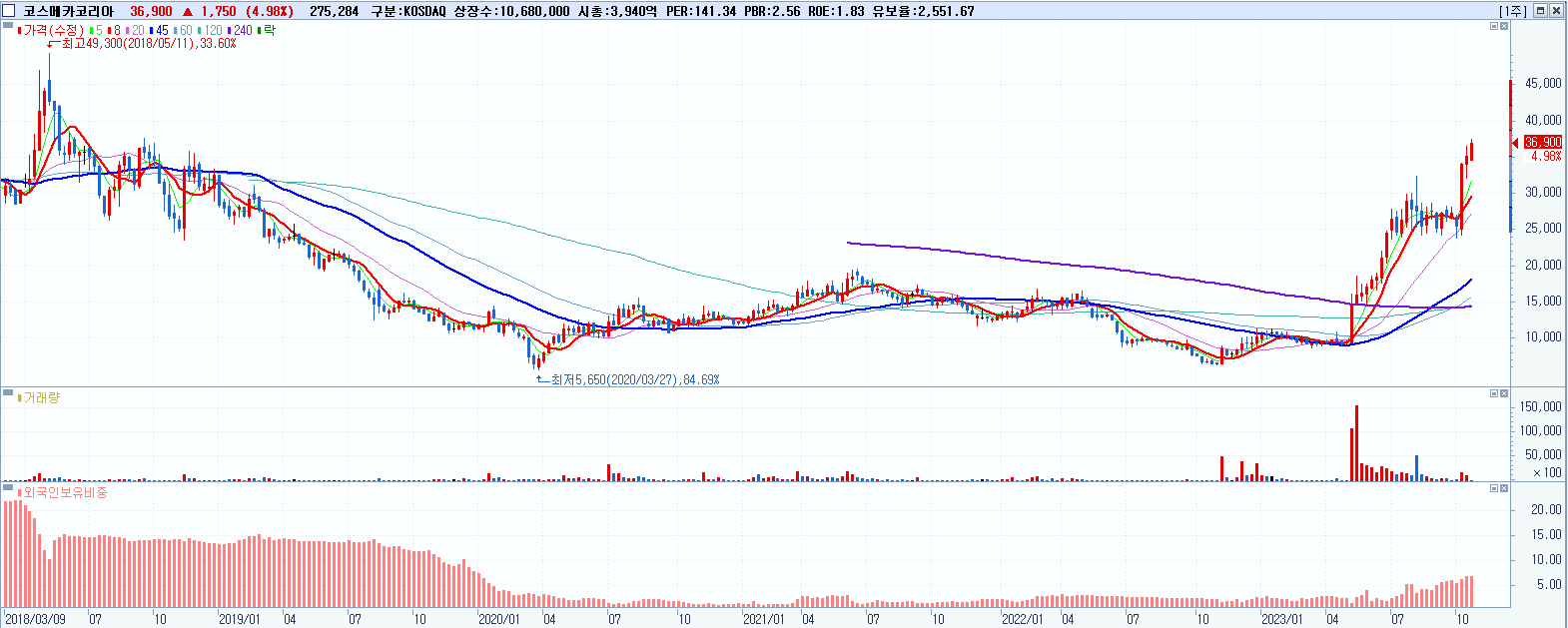 코스메카코리아 36,900원 ▲ 4.98% (KOSDAQ, 241710)