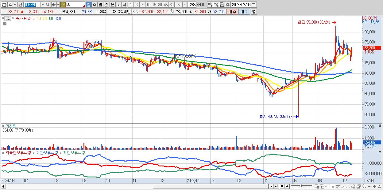 - LG (82,200원 ▲ 4.18% , 시총: 129,260억, 외국인 순매수 거래금:134억)