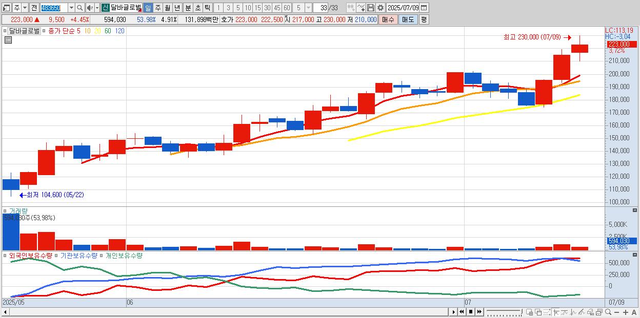 2.달바글로벌 223,500원 ▲ 4.68% (KOSPI, 483650)
