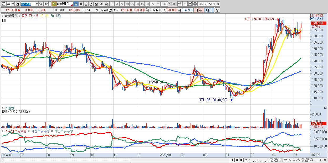 - 삼성물산 (170,700원 ▲ 2.46% , 시총: 290,150억, 외국인 순매수 거래금:140억)
