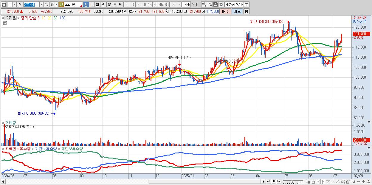 - 오리온 (121,600원 ▲ 2.88% , 시총: 48,076억, 외국인 순매수 거래금:67억)