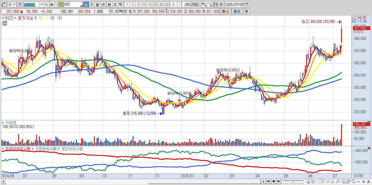 - KCC (356,000원 ▲ 9.04% , 시총: 31,636억, 외국인 순매수 거래금:70억)
