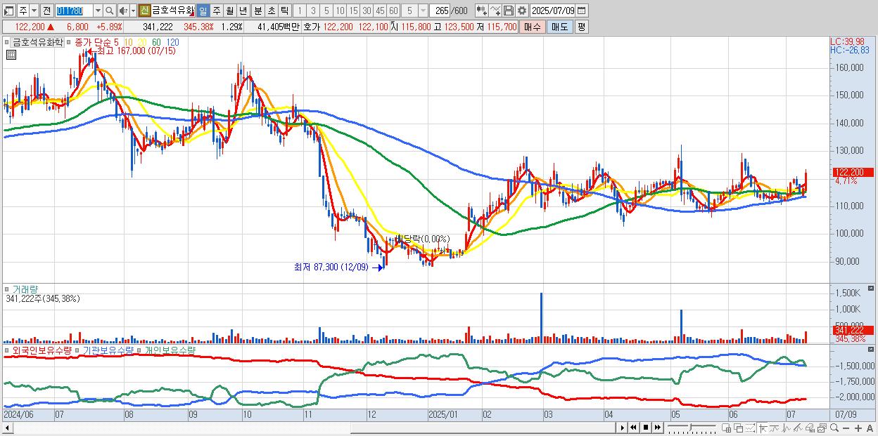 - 금호석유화학 (122,500원 ▲ 6.15% , 시총: 32,413억, 외국인 순매수 거래금:99억)