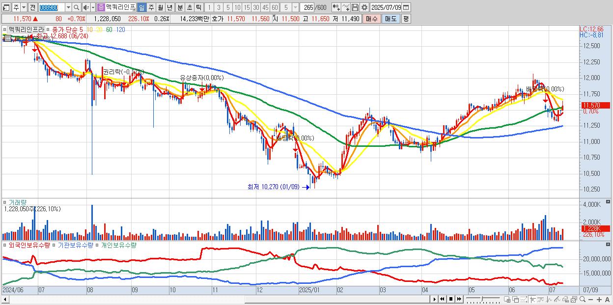 - 맥쿼리인프라 (11,570원 ▲ 0.7% , 시총: 55,411억, 외국인 순매수 거래금:65억)
