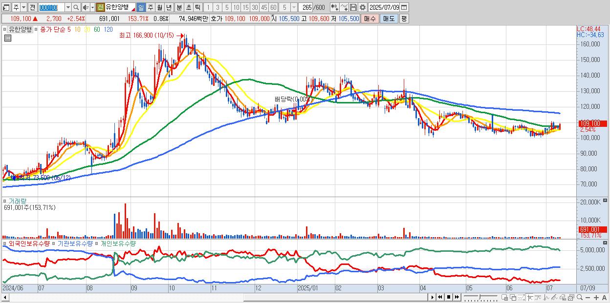 - 유한양행 (109,200원 ▲ 2.63% , 시총: 87,326억, 외국인 순매수 거래금:156억)